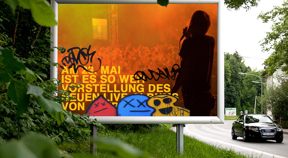 Die Plakate sollen den Eindruck vermitteln, dass der Bandname übersprayt wurde. Bei den Flyern ist er weggerissen und in einem Radiospot wird er akustisch abgeschnitten. Parallel dazu startet eine Facebook-Aktion in der Leute fragen, ob jemand wisse, um welche Band es sich handelt. Nach 2 Wochen wird das Geheimnis gelüftet. Wichtig ist, dass die Werbemittel nur recht spärlich eingesetzt werden, damit die Leute zumindest anfangs daran glauben, dass der Bandname unabsichtlich fehlt.