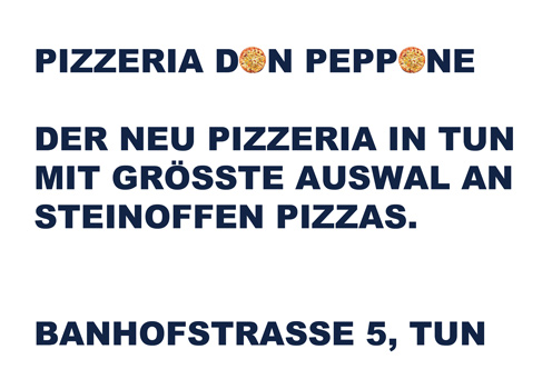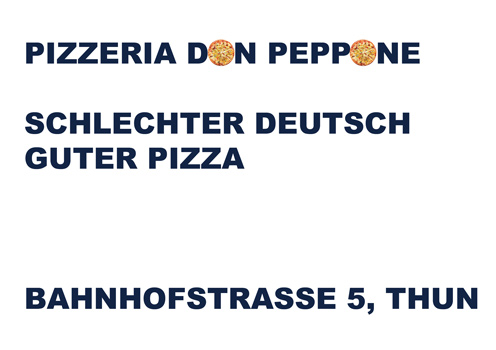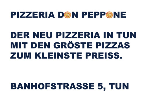 Zwei verschiedene Plakate machen auf die neue Pizzeria aufmerksam. Sie wirken sehr "handgestrickt" und beinhalten viele Rechtschreibefehler. Später werden sie durch ein drittes Plakat ersetzt, das den Slogan der Pizzeria beinhaltet: "Schlechter Deutsch, Guter Pizza".