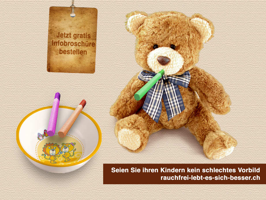Ein Teddy, dem zum Spiel ein Holzstäbchen als Zigarette in den Mund gesteckt wurde, soll zeigen, was für ein Vorbild man gegnüber Kindern abgibt, wenn man in ihrer Gegenwart raucht.